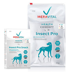 Unser MERAVITAL Insect Pro greift daher auf Insekten zurück, eine äußerst seltene Proteinquelle, die demnach ein entsprechend geringes Allergiepotenzial aufweist. Zusätzlich enthält das Futter einen Biotin Komplex aus Vitamin B1, B2, B6, B12, Niacin, Folsäure und Pantothensäure, der sich positiv auf die Haut- und Fellbeschaffenheit auswirken kann. Zink kann das Immunsystem zusätzlich unterstützen. Für eine optimale Rundumversorgung führen wir außerdem passende MERAVITAL Insect Pro Snacks, die dem Tierhalter trotz der Futtermittelallergie erlauben den Hund zu verwöhnen und belohnen.