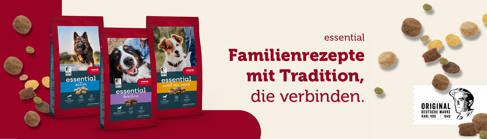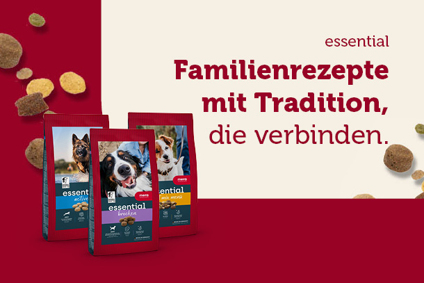 Essential ist die unkomplizierte, in der Region hergestellte Qualitätsnahrung nach bewährten Rezepturen. Essential überzeugt mit hoher Akzeptanz und wertvollen Inhaltsstoffen, die die Bedürfnisse deines Hundes abdecken. Die Produktlinie bietet dir verschiedene Sorten und Mix-Menüs für normal aktive sowie aktive Hunde. Zwei Softprodukte runden die essential Produktlinie ab.