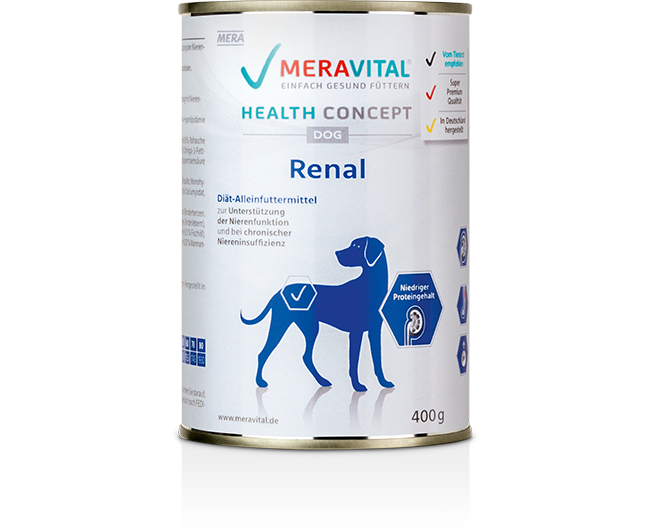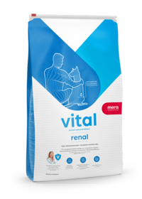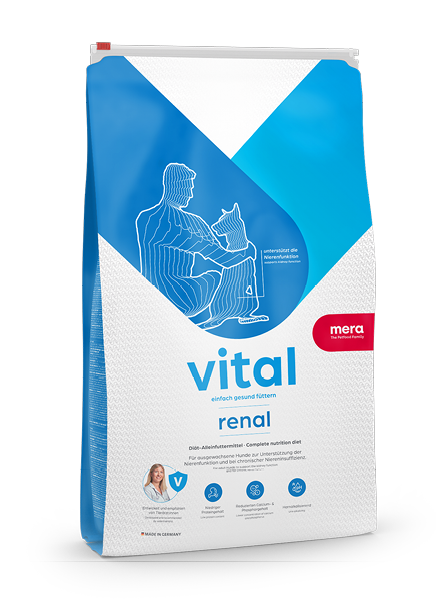 Bei Nierenproblemen ist häufig eine Anpassung der Ernährung erforderlich. Mera bietet mit vital renal Nassfutter und vita renal Trockenfutter ein von Tierärzten und Ernährungswissenschaftlern entwickeltes Premium Diät Futter. Es ist perfekt auf die Bedürfnisse nierenkranker Hunde abgestimmt. Dazu zählt ein angepasster Gehalt an Proteinen und Phosphor, ein spezifisches Mineralstoffverhältnis und hochwertige Omega-3-Fettsäuren, die sich positiv auf die Filterleistung der Nieren auswirken können. vital renal eignet sich bei folgenden Indikationen: Chronische Nierenschwäche, Prophylaxe von Xanthinsteinen, Vorbeugung von Calciumoxalatsteinen.