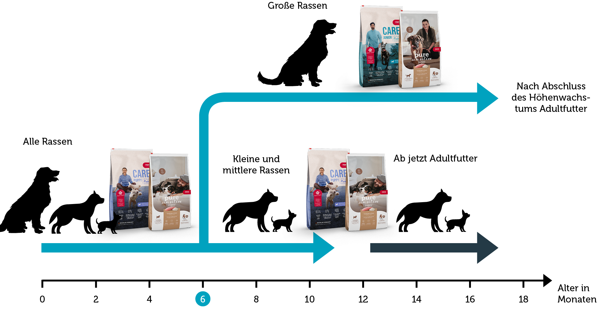 Große und Riesenrassen mit mehr als 40 kg Endgewicht fressen in ihren ersten fünf Lebensmonaten ebenfalls Puppy und ab dem 6. Monat CARE Junior Huhn bzw. pure senstitive Junior Truthahn & Reis, um die genannten Wachstumsschäden, die aufgrund einer Energieüberversorgung auftreten können, zu vermeiden. Auch diese beiden Welpenfutter sollten in jedem Fall bis zum Ende des Höhenwachstums verfüttert werden, also bei Riesenrassen bis etwa zum 18. bis 20. Monat (Dogge).