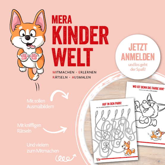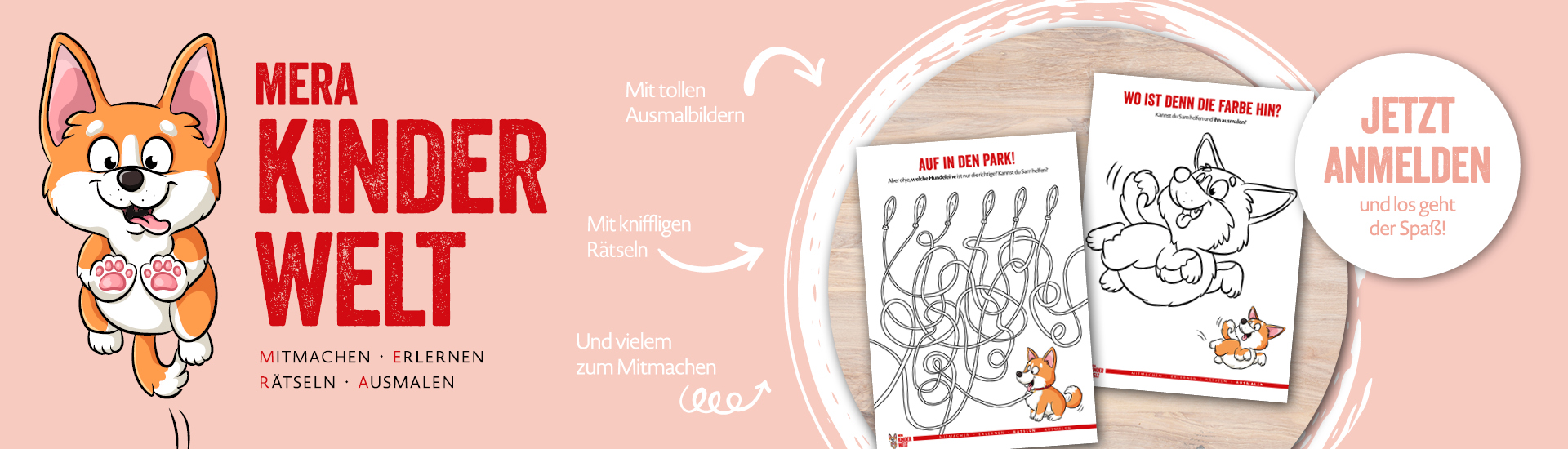 In unserer MERA Kinderwelt erwarten dich weitere spannende, spielerische und spaßige Inhalte für ein harmonisches Zusammenleben zwischen Kind und Hund. Unser Family-Newsletter versorgt dich regelmäßig mit wissenwerten Spielen, bunten Ausmalbildern und kniffligen Rätseln.