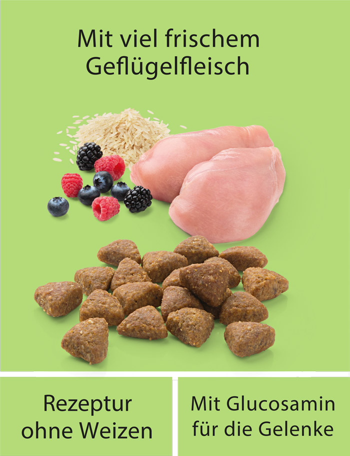 Reis (26%), Geflügelprotein (25,5%, z.T. getrocknet u. hydrolysiert), Geflügelfrischfleisch (15%), Maiskleber, Geflügelfett, Rübentrockenschnitzel (3%), Lignocellulose (3%), Leinsamen (2%), Lachsöl (1,5%), Leberhydrolysat (1%, getrocknet), Sonnenblumenöl (1%), Natriumchlorid, Kaliumchlorid, Monocalciumphosphat, Calciumsulfat (wasserfrei), Zichorien-Inulin (0,2%), Hefezellwände (getrocknet, = 0,042% beta-Glukane u. 0,038% Mannan-Oligosaccharide), Himbeere*, Brombeere*, Blaubeere*, Yucca schidigera-Pulver, Glucosamin aus tierischem Gewebe (0,02%), Chondroitinsulfat (0,01%).