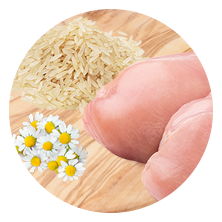 Hühnerprotein (32,5%, z.T. getrocknet u. hydrolysiert), Reis (32%), Hühnerfrischfleisch (15%), Eipulver (4%), Hühnerfett, Rübentrockenschnitzel (2,5%), Lignocellulose (2%), Leinsamen (2%), Leberhydrolysat (1%, getrocknet), Lachsöl (0,8%), Natriumchlorid, Sonnenblumenöl (0,5%), Kaliumchlorid, Zichorien-Inulin (0,2%), Calciumsulfat, Psylliumschalen (0,2%), Hefezellwände (getrocknet, = 0,042% beta-Glukane u. 0,038% Mannan-Oligosaccharide), Kamillenblüten (0,1%), Yucca schidigera-Pulver.