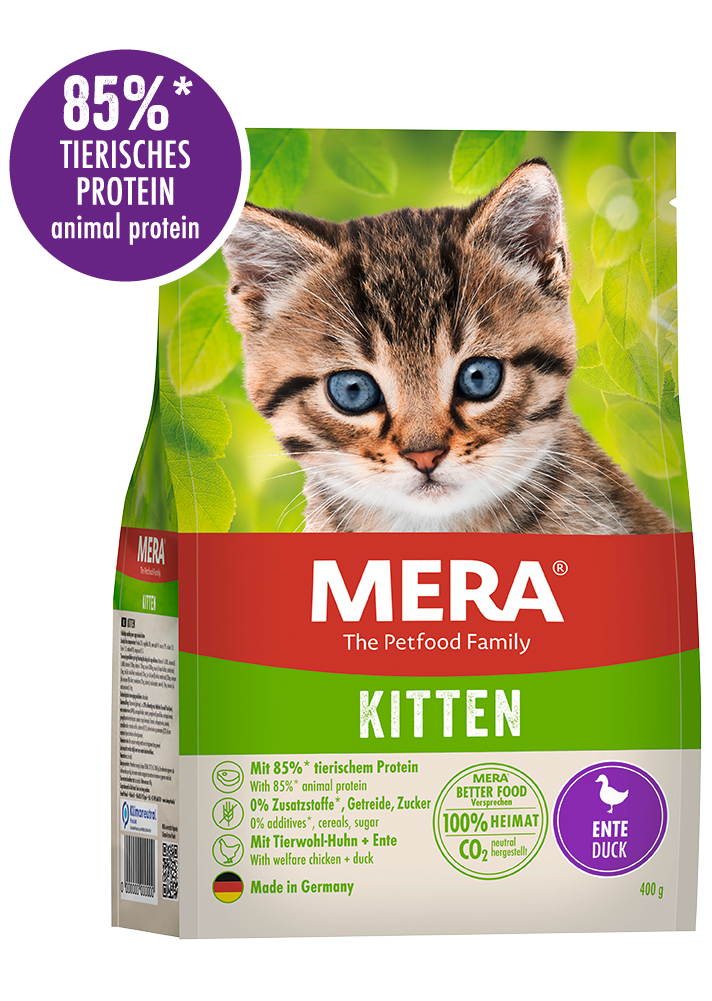 Du fragst dich, warum spezielles Futter für dein Kitten so wichtig ist? Ernährungskonzepte für Katzenfutter werden bei MERA auf die individuellen Bedürfnisse des Tieres abgestimmt. Unter anderem in Abhängigkeit von der Lebensphase, sprich dem Alter des Tieres und der Größe. Aus diesem Grund gibt es von MERA Katzenfutter für Kitten, erwachsene Katzen und Senioren. Um dein Kitten artgerecht zu füttern, solltest du dich für ein hochwertiges Kittenfutter entscheiden, denn dieses sorgt für eine extra Portion Energie und Nährstoffe.