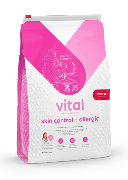 vital skin control + allergic enthält einen Komplex aus Vitamin B1, B2, B6, B12, Niacin, Folsäure und Pantothensäure, der die Hautbarriere stärken und sich positiv auf die Haut- und Fellbeschaffenheit auswirken kann. Biotin und Zink regenerieren Haut und Fell und stärken das Immunsystem. Omega-3-Fettsäuren lindern aktiv entzündliche Prozesse in der Haut bzw. im Darm. vital skin control + allergic gibt es als Nassfutter und Trockenfutter.