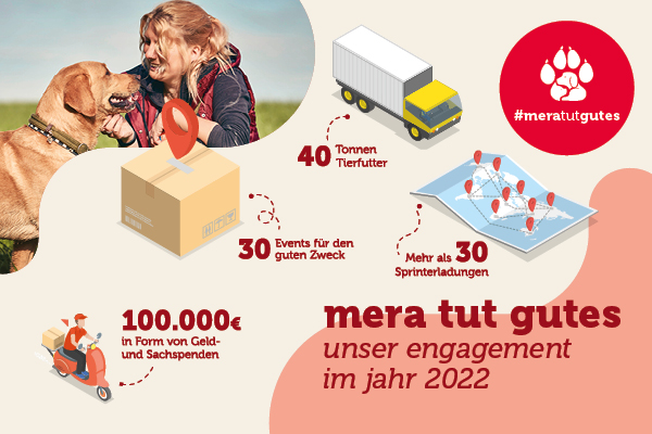 Im Jahr 2022 hat mera insgesamt 40 Tonnen Tierfutter und 100.000 Euro in Form von Geld- und Sachspenden an verschiedene Tierschutzprojekte gespendet. „Uns liegt Tierschutz einfach in der DNA und wir möchten unsere Möglichkeiten dazu nutzen, möglichst vielen Tieren ein erfülltes Leben in einem liebevollen Zuhause zu ermöglichen“, erklärt Felix Vos, der mera bereits in dritter Generation leitet.