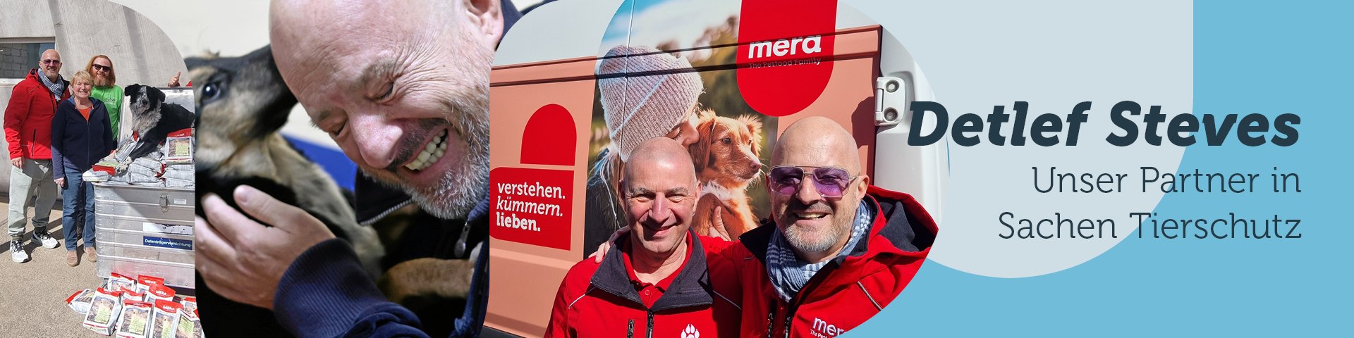 Der TV-Star und ehemalige Gastronom Detlef Steves ist als Markenbotschafter für mera aktiv und unterstützt mit uns gemeinsam verschiedene Tierschutzprojekte. Wir setzen uns schon seit Jahrzehnten für die Bedürfnisse von Tieren ein und engagieren uns unter dem Schlagwort "mera tut Gutes" für den Tierschutz. Zusammen mit Detlef Steves möchten wir auf die wahren Tierschutzhelden aufmerksam machen und möglichst vielen Tieren ein liebevolles Zuhause ermöglichen. Passend dazu ist Detlef nun der Schirmherr für unsere ganz neue Produktlinie CARE - mit der Hundebesitzer:innen gleich doppelt Gutes tun können.