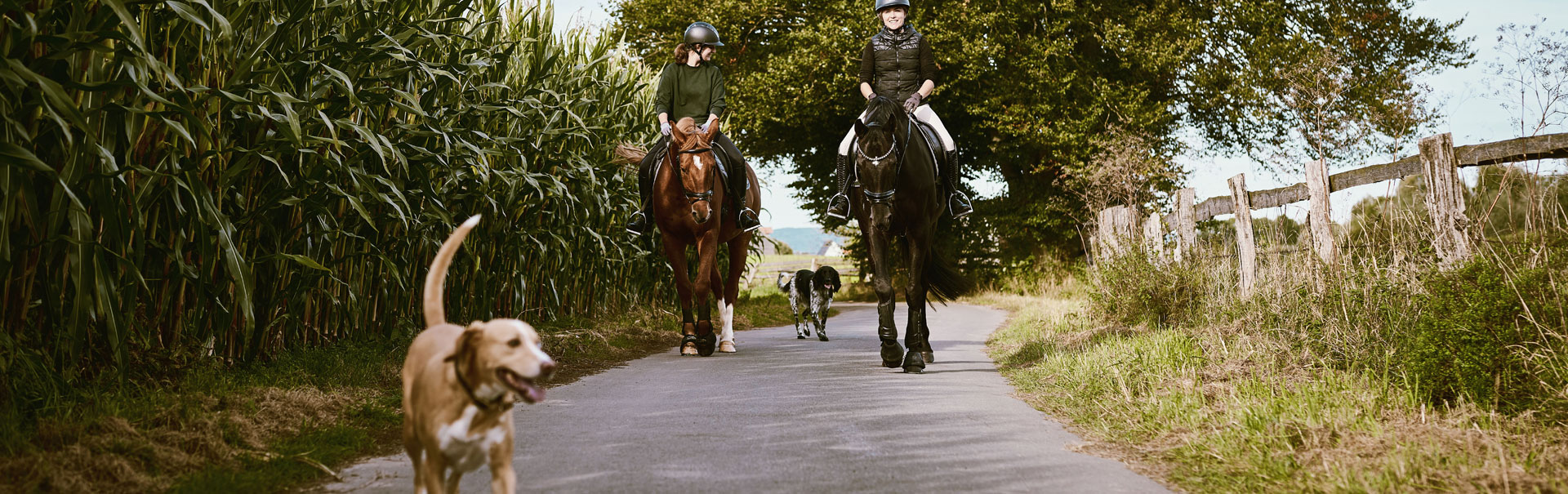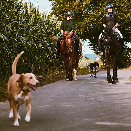 Die vier leben zusammen mit Pferd Elli auf einem Hof in Steinheim und haben sich richtig gut miteinander eingewöhnt: „Der Tag fängt morgens schon gemeinsam an, wenn ich mit meiner Tasse Kaffee und beiden Hunden im Schlepptau meinem Pferd „Guten Morgen“ sagen gehe. Ansonsten sind Oscar und Quinnie bei so ziemlich allem dabei, ausser wenn ich arbeite. Die Tiere geben einem eine Aufgabe und die Zeit, die man mit ihnen verbringt ist immer schön, häufig sehr lustig und nie verschwendet. Tiere sind für mich Familienmitglieder, wenn ich ihnen in die Augen sehe, sehe ich keinen Unterschied, Tier und Mensch sind für mich gleich.“