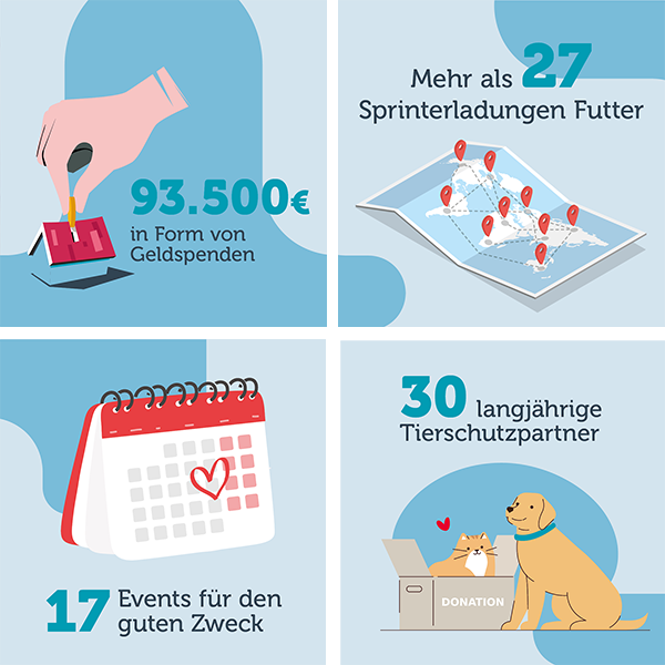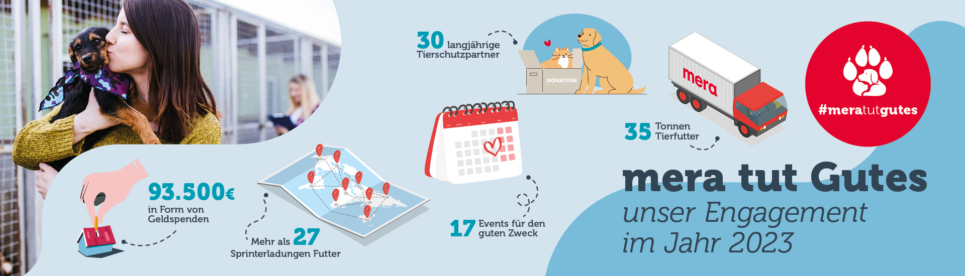 Nach einem gründlichen Kassensturz hat unser engagiertes "mera tut Gutes"-Team, insbesondere die liebe Anna und Uwe, Bilanz über unser karitatives Engagement und unsere Tierschutzmaßnahmen im Jahr 2023 gezogen. Das Ergebnis? Mera hat im vergangenen Jahr mehr als 90.000 Euro für wohltätige Zwecke gespendet und über 35.000 kg Futter an bedürftige Tiere verteilt. Dies entspricht etwa 27 vollbeladenen mera-Sprintern, die aufgebrochen sind, um Tierheime, Vereine und weitere unterstützte Einrichtungen zu erreichen.
